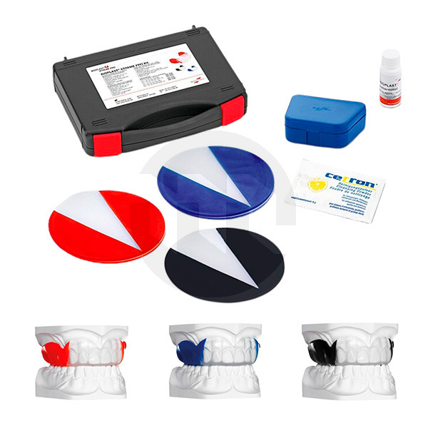 Nova placa de proteção bucal com reforço integrado na zona sensível dos dentes anteriores. Pela primeira vez, dois materiais com diferentes graus de dureza são combinados numa única placa. A inserção de material duro em forma de V permite variar a largura individual da zona anterior.