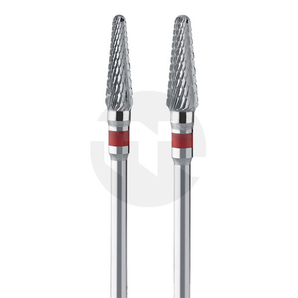 Brocas de carboneto de tungsténio de alta qualidade com geometria de corte transversal fina, concebidas para o acabamento preciso de resinas, acrílicos e metais não preciosos em laboratórios de prótese dentária.