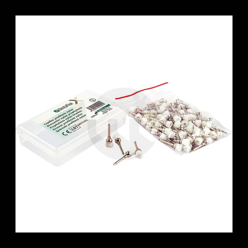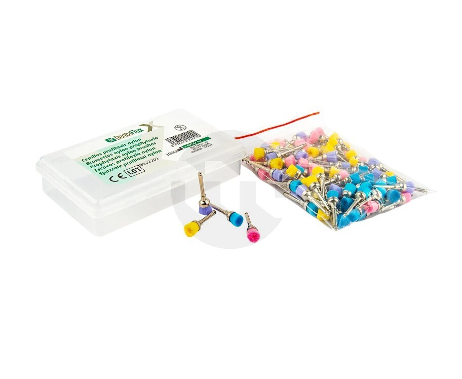 Escovas de Nylon da marca Dentaflux são apresentadas com cores sortidas. As escovas de Dentaflux são utilizadas para profilaxia, limpeza e polimento dos dentes.