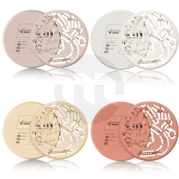 Cores: Natural, Branco, Dentina e Gengiva. Os blocos DDpeek MED oferecem a combinação ideal de biocompatibilidade e resistência à fratura.