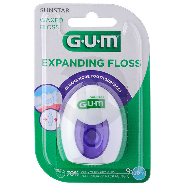 O fio dentário GUM EXPANDING é fino e fácil de inserir. Uma vez inserido, o fio expande-se consideravelmente. Isso permite que se adapte facilmente a todos os espaços entre os dentes e alcance uma área maior da sua dentição. Também facilita a limpeza abaixo da linha da gengiva.