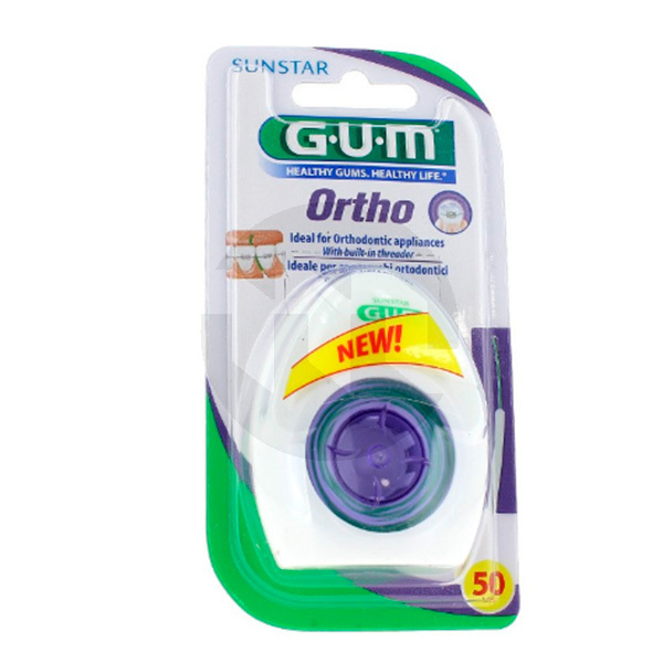 O fio dentário Gum Ortho possui um passador embutido para ajudar a guiar o fio entre os dentes. Expande-se para se ajustar a espaços de diferentes tamanhos entre os dentes, aumentando o contato com a superfície do dente e melhorando a remoção da placa bacteriana.