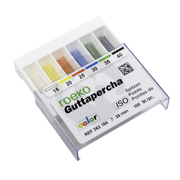 Pontas de guta-percha COLOR: Cor ISO, radio-opacas, precisão dimensional absoluta, em conformidade com a norma ISO. Comprimento: 28 mm. Totalmente automatizado, norma GMP.