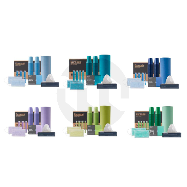 Embalagem prática com 6 produtos descartáveis disponíveis em várias cores: 100 Monoart Towel Up! (2 camadas de papel + 1 de plástico, tamanho: 45 x 33cm), 1 caixa de 100 lenços de papel descartáveis, 100 Monoart Saliva ejetor EM15 (ejetor de saliva descartável em PVC, ponta amovível, Ø 6,5 mm. e 15 cm. de comprimento, 100 Monoart Copo de plástico (capacidade 200cc), 100 Monoart Máscara Proteção 3 (três camadas de proteção, TNT hidrofóbico e hidrofílico com TNT hidrofóbico com capacidade 200cc.) e 15 cm. de comprimento), 100 Monoart Copo de plástico (capacidade 200cc), 100 Monoart Mask Protection 3 (três camadas de proteção, TNT hidrofóbico e hidrofílico com filtro anti-partículas), 80 Monoart Bib PG30 (1 camada de papel + 1 camada de polietileno impermeável. Elevada capacidade de absorção para proteger o doente. Largura: 53 cm. Comprimento 61 cm).
