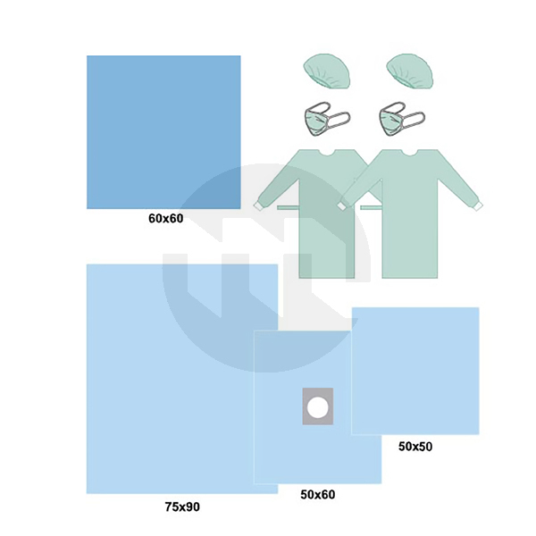 1 Campo cirúrgico (SMS) 60x60cm2 Bata de consulta com mangas p.p. 40 grs.2 Máscaras faciais elásticas2 Touca de enfermagem pp. circular1 Campo cirúrgico s/adesivo (IS) 50cm x 50cm1 Campo cirúrgico s/adesivo (IS) 75cm x 90cm1 Campo cirúrgico fenestrado (IS) 50cm x 60cm