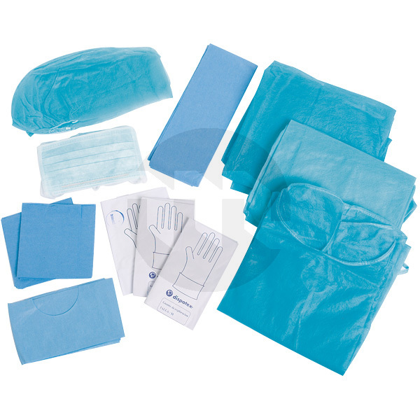 Kit composto de: 1x Campo de cobertura (SMS) 60x60 cm + 1x Campo cirúrgico com janela sem adesivo (IS) 50x60 cm + 1x Campo cirúrgico (L) 75x100 cm + 2x Campos cirúrgicos (L) 50x60 cm + 3x Máscaras cirúrgicas com fitas + 2x Gorros enfermeira com elástico + 1x Gorro de cirurgião p.p. com cordões + 3x Bata protetora não esterilizada com punhos p.p. 28/30 g + 3x Pares de luvas de látex (4x Luvas de látex c/capa tamanho (M) + 2x Luvas de látex c/capa tamanho (L)).
