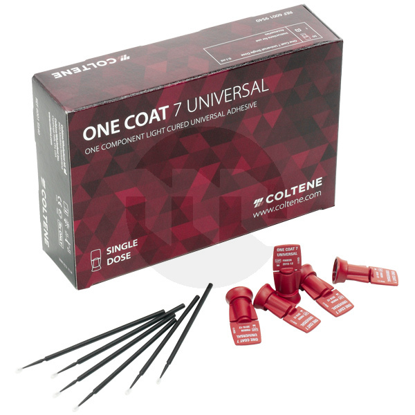 One Coat 7 UNIVERSAL. Um adesivo para todos os casos clínicos. Adesão máxima em dentina e esmalte, adesivo monocomponente que pode ser utilizado como auto-condicionante, condicionamento total ou condicionamento seletivo e polimerização dupla com ativador, sem necessidade de silano.