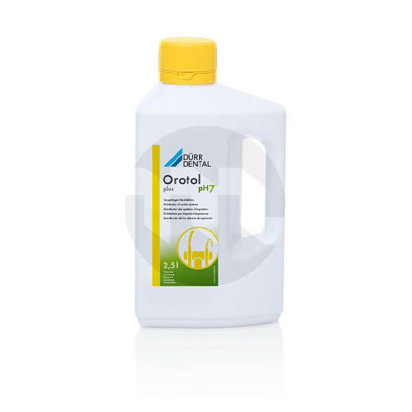 O Orotol plus pH 7 é um concentrado líquido neutro e altamente eficaz para a desinfeção, limpeza, desodorização e manutenção simultâneas de todos os sistemas de aspiração dentário e separadores de amálgama.