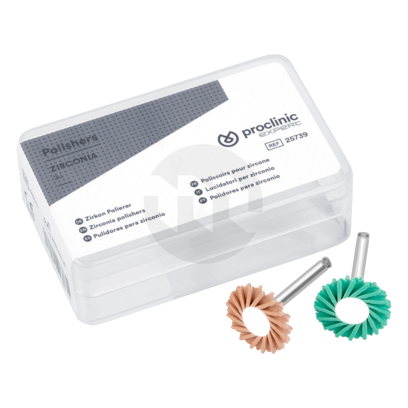 Sistema de discos de polimento em 2 passos para zircónio. Ideal para o ajuste e correção de restaurações como inlays, onlays, facetas e coroas feitas deste material. Elevada concentração de partículas de diamante para uma maior eficácia. Para contra-ângulo. Plidor verde para pré-polimento e polidor rosa para polimento brilhante. 14 mm de diâmetro.