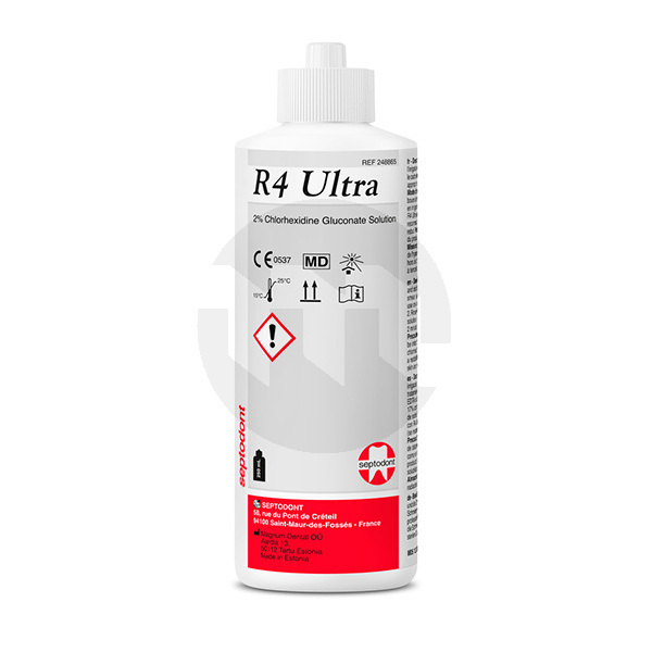 Solução de digluconato de clorexidina (2%) para irrigação e desbridamento após instrumentação em tratamento endodôntico.