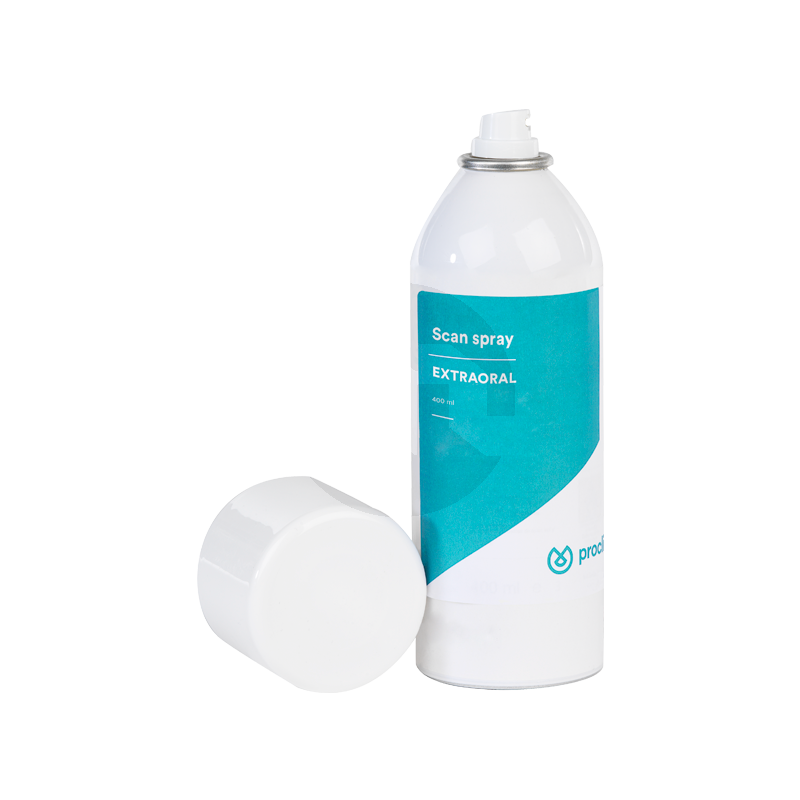 Spray extraoral antirreflexo para digitalização em laboratórios dentários, de alta precisão compatível com todos os sistemas de digitalização atuais e pode ser utilizado em qualquer material (Metal, PmmA, Ti) pois cria um filme com pigmentos muito finos, 100% solúvel em água e fácil de dosar. NÃO pode ser usado para digitalização intraoral.