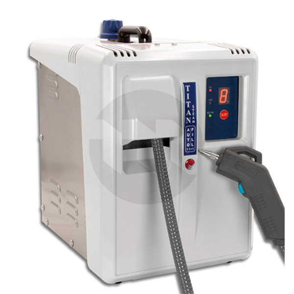 O jacto de vapor TITAN AUTOFILL opera com um sistema de enchimento híbrido: pode ser abastecido manualmente no início, mas possui uma bomba automática que mantém o nível de água durante a utilização, puxando água de um reservatório externo de água destilada. Isto elimina a necessidade de interromper o trabalho, arrefecer a máquina ou libertar pressão, permitindo um funcionamento contínuo e ininterrupto.
